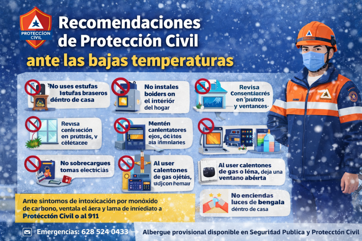 Ante las bajas temperaturas, la Coordinación Municipal de Protección Civil comparte estas recomendaciones para prevenir riesgos en esta temporada invernal: No uses estufas o braseros dentro de casa No instales boilers en el interior del hogar Mantén ventilación en puertas y ventanas Revisa conexiones de gas y que la flama sea azul No sobrecargues tomas eléctricas Mantén calentadores lejos de objetos inflamables Al usar calentones de gas o leña, deja […]