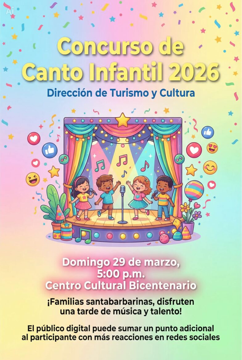¡Talento infantil a escena! Este domingo será el gran Concurso de Canto en Santa Bárbara La Dirección de Turismo y Cultura de nuestro municipio invita a todas las familias santabarbarinas a ser parte de una tarde llena de música y talento en el Concurso de Canto Infantil 2026. La cita es este domingo 29 de marzo a las 5:00 p.m. en el Centro Cultural Bicentenario. Este evento busca brindar un […]