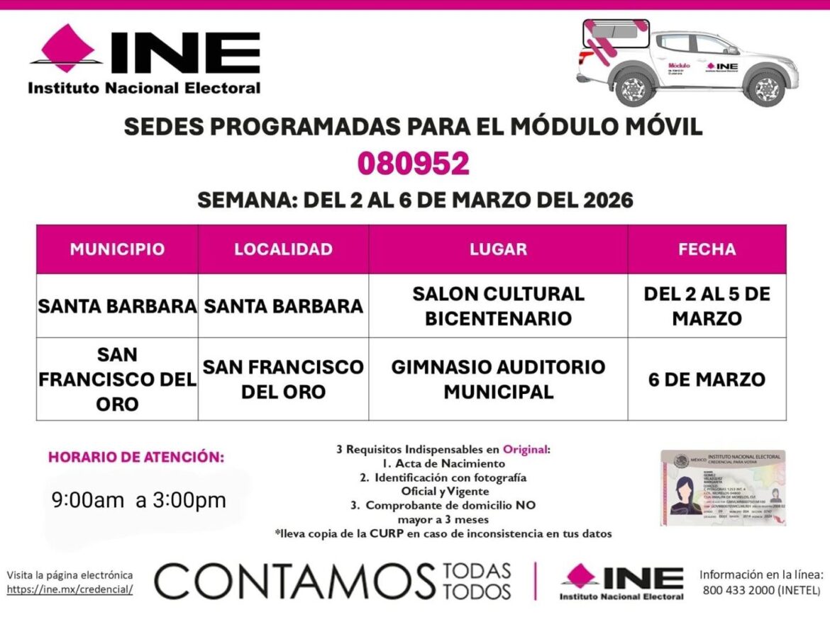 El módulo del INE estará en Santa Bárbara del 2 al 5 de marzo, en el Centro Cultural Bicentenario, en un horario de 9:00 a.m. a 3:00 p.m.Si ya hiciste tu trámite, puedes pasar por tu credencial.Si vas a renovarla o sacarla por primera vez, lleva estos documentos: Acta de nacimiento Identificación oficial con fotografía vigente Comprobante de domicilio no mayor a tres meses Copia de la CURP (solo si hay inconsistencias en tus […]